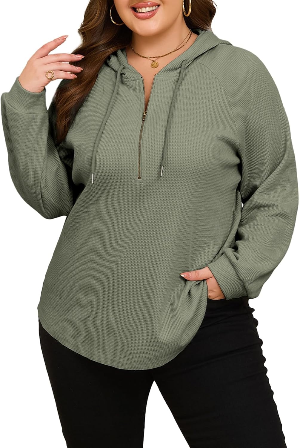 • Design:Womens plus size sweatshirts with long sve,drawstring,solid color,loose fit style.The waffle knit texture provides breathable warmth,slight stretch ensure a loose,comfy fit.Stay chic all fall and winter