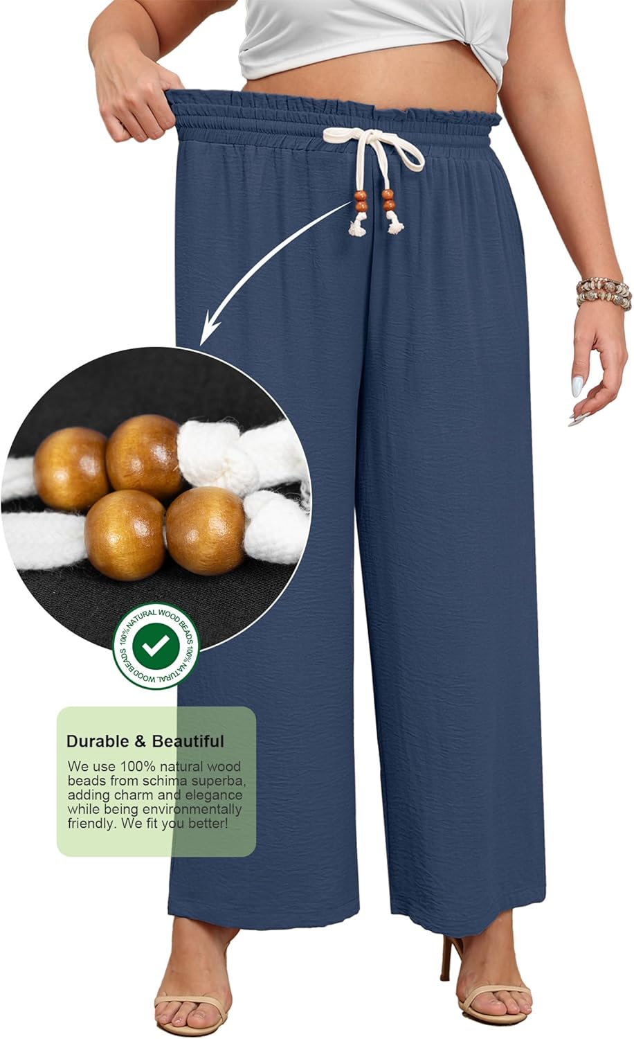 - 【 Stylish Design】:100% Natural wooden beads, high rise wide leg pants are designed in plus size, straight wide leg, ruffled elastic high waisted, adjustable drawstring, casual style, cute wood beads, solid&floral print, loose fit, convenient side slant pockets. Even if you have a curvy figure, or have thick calves and thighs, flowy paper bag pants can work well for any shape.