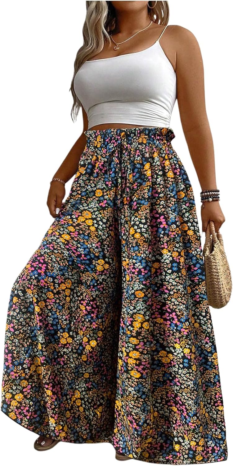 Women’s Plus Size Floral Baggy Pants Boho Drawstring Wide Leg Flowy Vacation Palazzo Pants